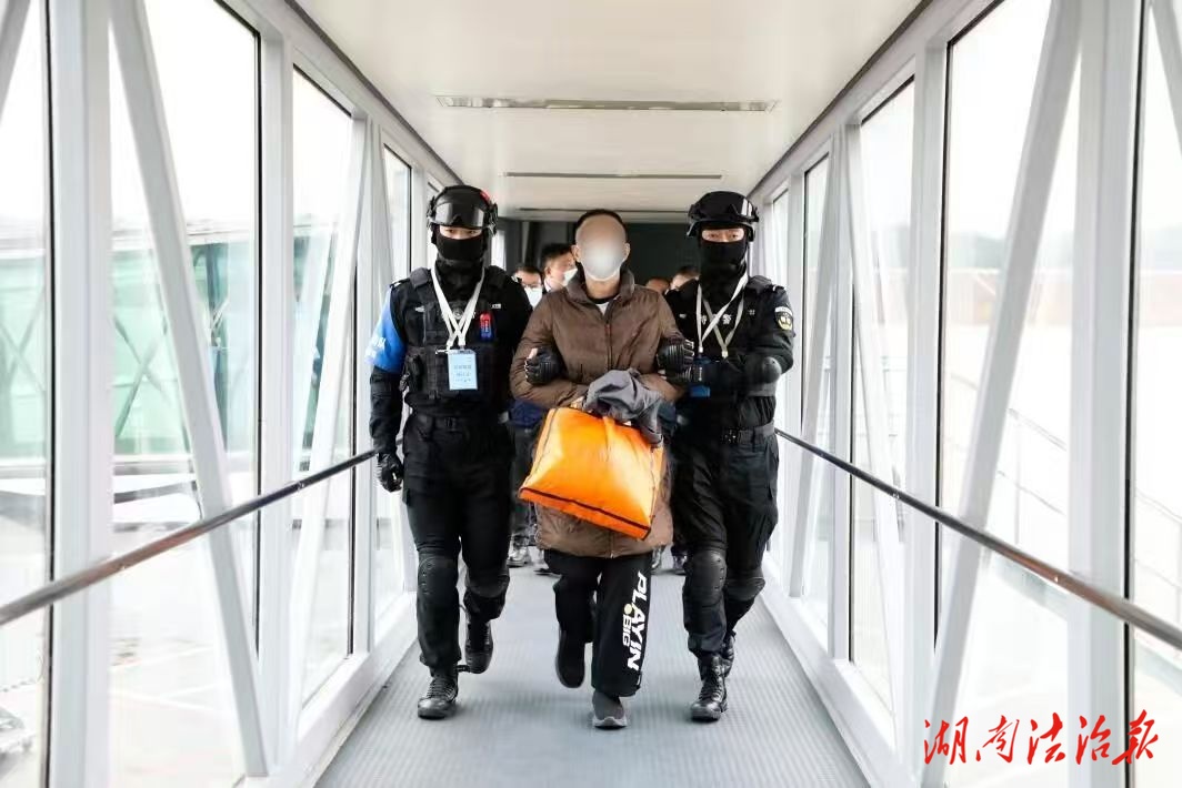圖片2:衡陽公安民警押解犯罪嫌疑人返衡。(拍攝:李華中)