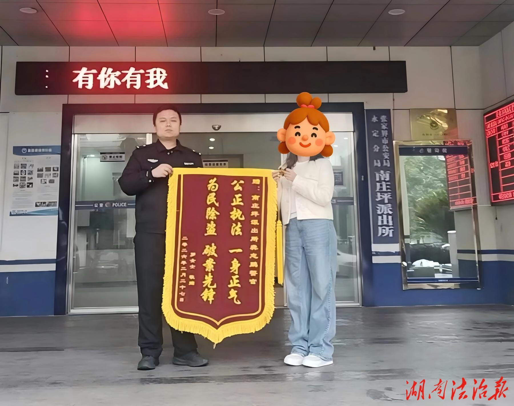 近日,轄區(qū)群眾羅女士將印有“公正執(zhí)法 一身正氣 為民除盜 破案先鋒”的錦旗送到南莊坪派出所,感謝民警快速破案、挽回損失。