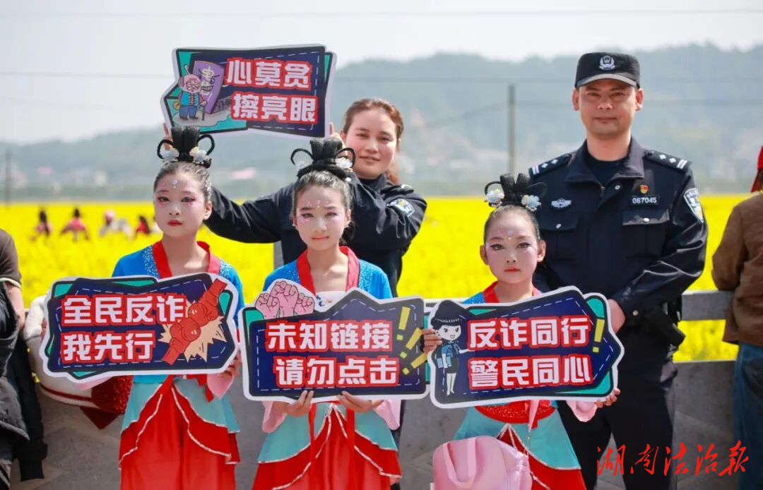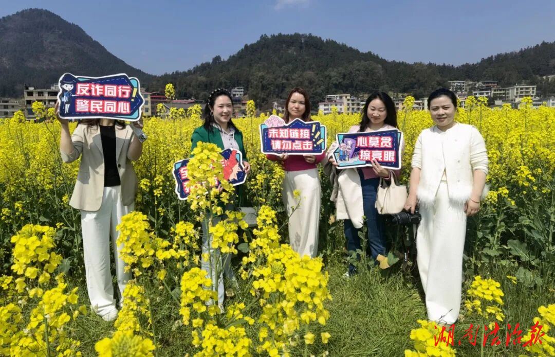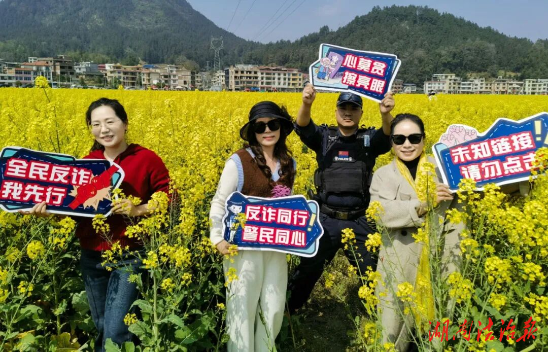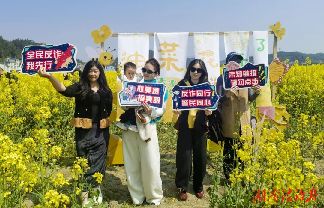 為增強宣傳趣味性和傳播力,民警精心準備了“心莫貪、擦亮眼”“全民反詐我先行”“反詐同行,警民同心”“未知鏈接,請勿點擊”等主題反詐手舉牌,邀請游玩的群眾、游客主動高舉手舉牌,在金黃的油菜花田中間駐足留影、流連忘返。大家一邊欣賞春日美景,一邊手持反詐標語打卡,在輕松愉悅的氛圍中加深了對反詐知識的記憶,不少群眾還主動將打卡照片分享到社交平臺,成為反詐宣傳的“義務(wù)宣傳員”。