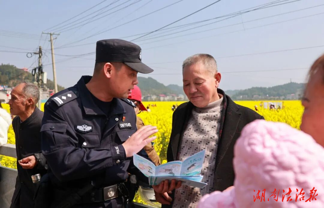 春風(fēng)送暖,金浪翻滾。3月13日以來,隆回縣司門前鎮(zhèn)石山灣村第三屆油菜花節(jié)隆重啟幕,漫山遍野的油菜花競相綻放,吸引了周邊群眾及各地游客紛至沓來,現(xiàn)場人流如織、暖意融融。隆回警方在全力做好安保執(zhí)勤工作的同時,巧借節(jié)慶人流集中的有利契機,組織獵豹突擊隊、司門前派出所民輔警深入田間地頭,開展“油菜花間話反詐”宣傳活動,讓反詐知識伴著花香走進群眾心中。