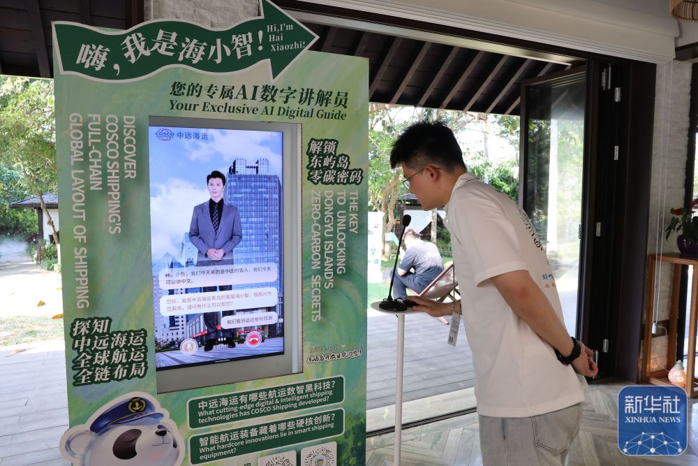 ↑ 3月25日,工作人員在博鰲亞洲論壇年會會場與AI數(shù)字講解員對話。
