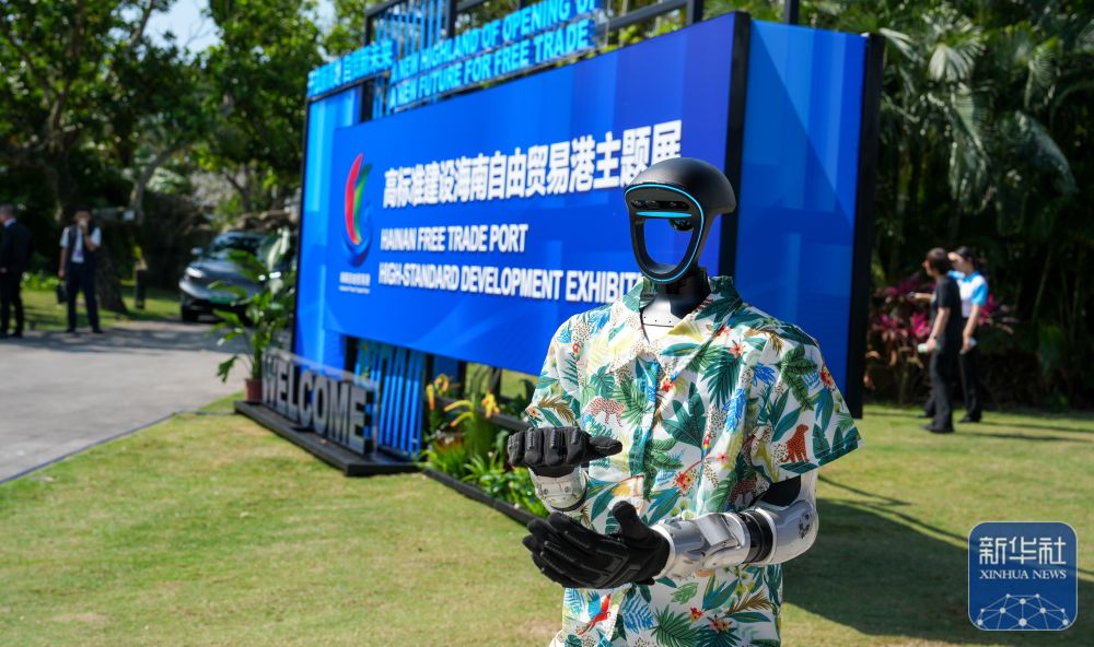 ↑ 3月24日,人形機器人在位于海南省瓊海市博鰲鎮(zhèn)東嶼島的高標(biāo)準(zhǔn)建設(shè)海南自由貿(mào)易港主題展上迎賓。