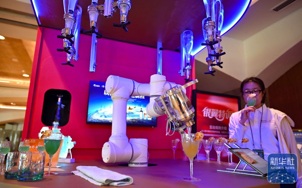 ↑ 3月25日,一款調(diào)酒機器人在博鰲亞洲論壇大酒店為參會人員調(diào)酒。